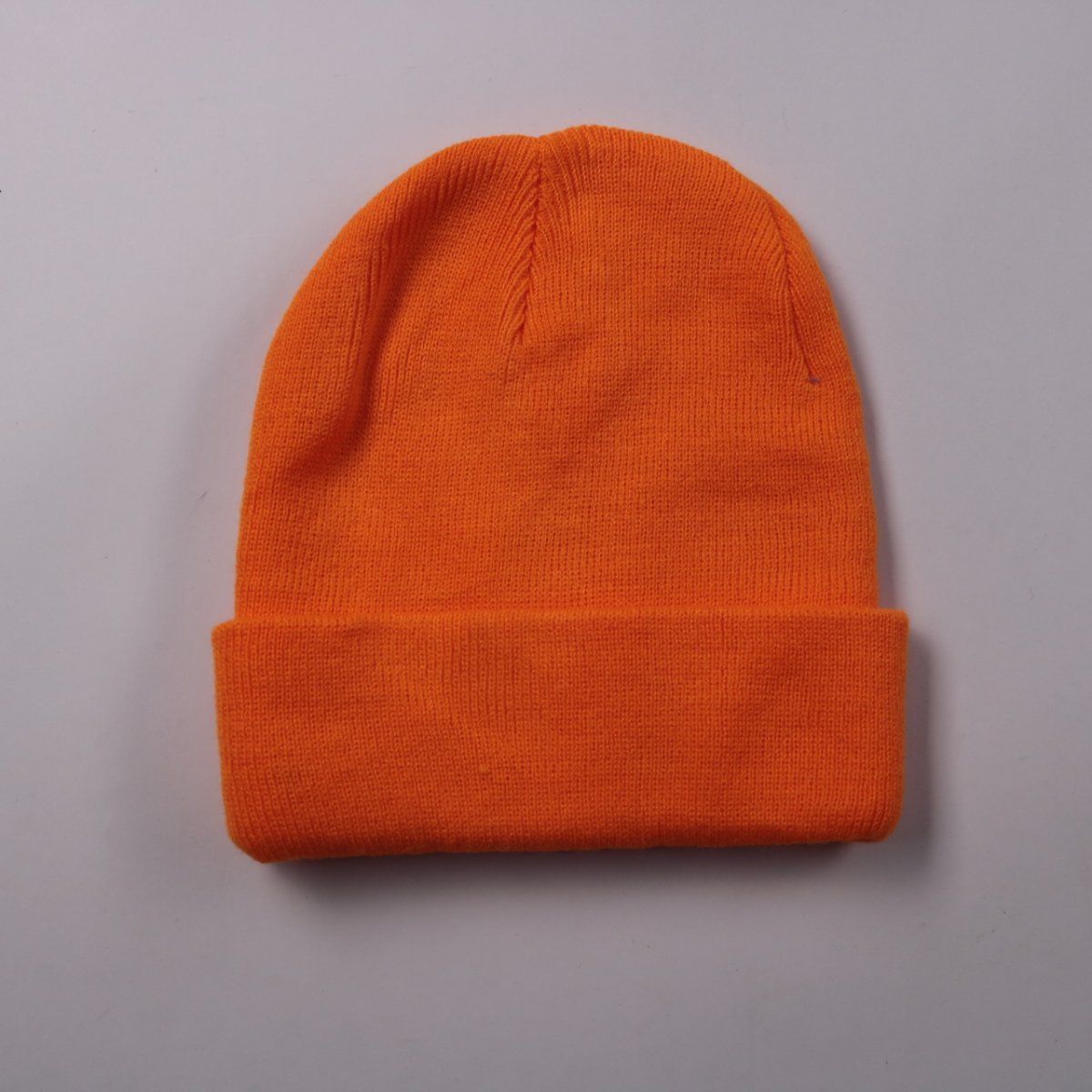 Вязаная шапка-бини ярко-оранжевого цвета без бренда. Подойдёт на каждый день для прогулок в холодную погоду и легко сочетается со спортивным и casual стилем. Плотная акриловая вязка хорошо держит форму и не требует сложного ухода.