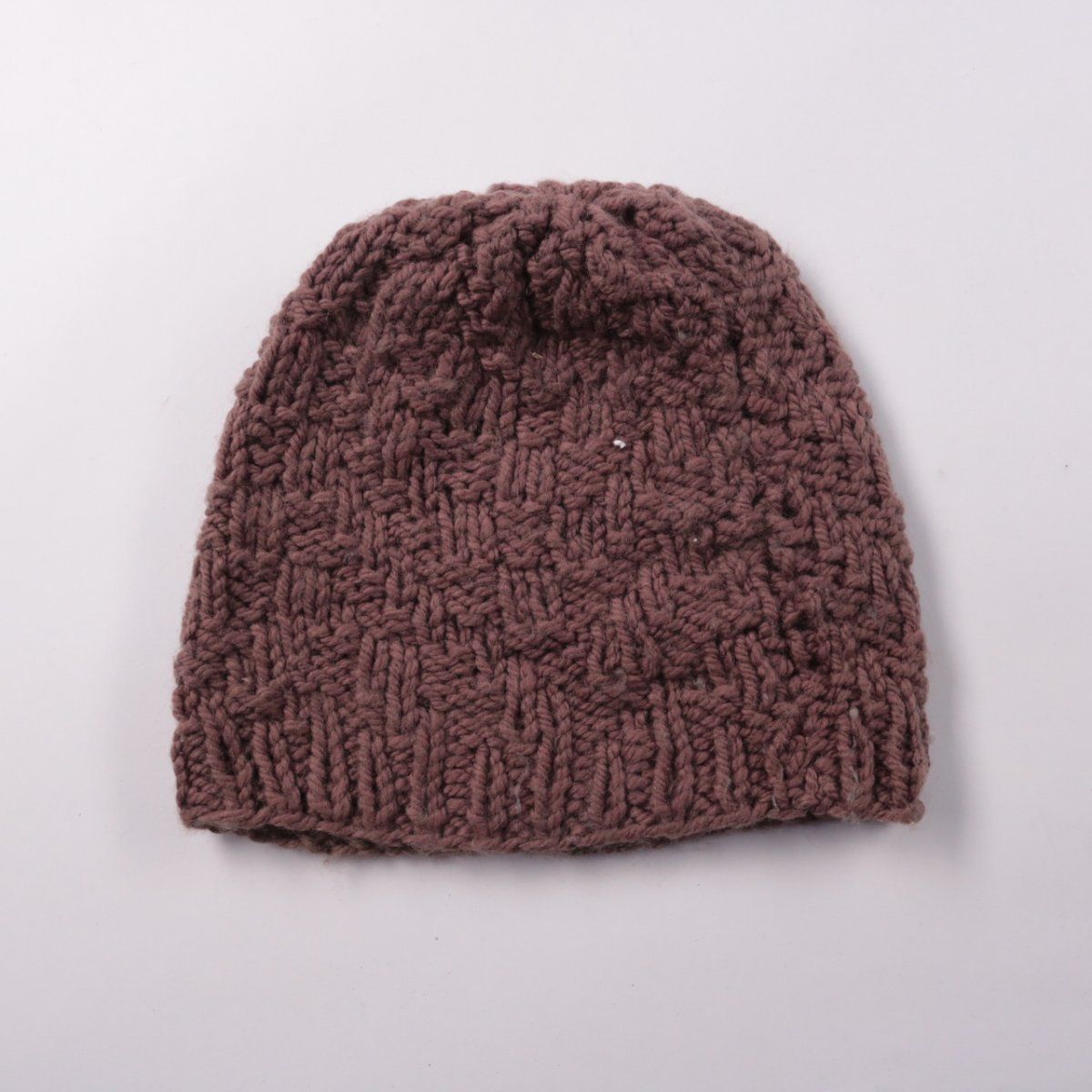 Вязаная шапка крупной вязки в коричневом цвете, без указания бренда. Подойдёт для повседневной носки в холодную погоду и прогулок. Плотная вязка хорошо держит тепло и защищает от ветра.
