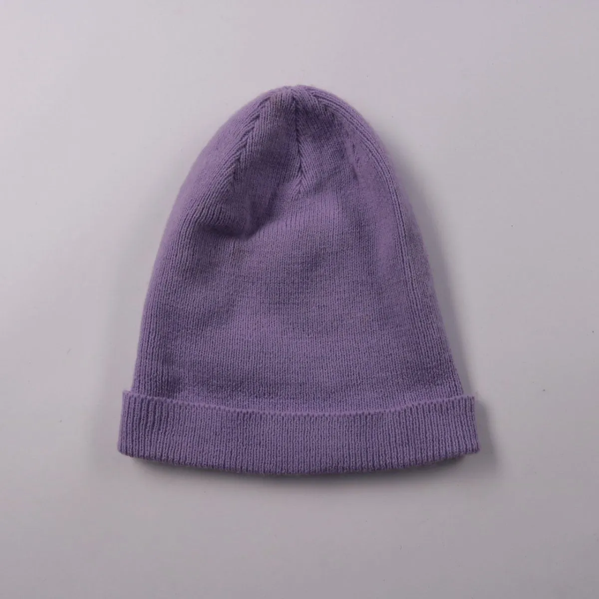 Вязаная шапка-бини в сиреневом цвете, без видимого бренда. Подойдёт для повседневной носки в холодную погоду и легко сочетается с базовой верхней одеждой. Благодаря мягкой вязке хорошо удерживает тепло и комфортно сидит на голове.