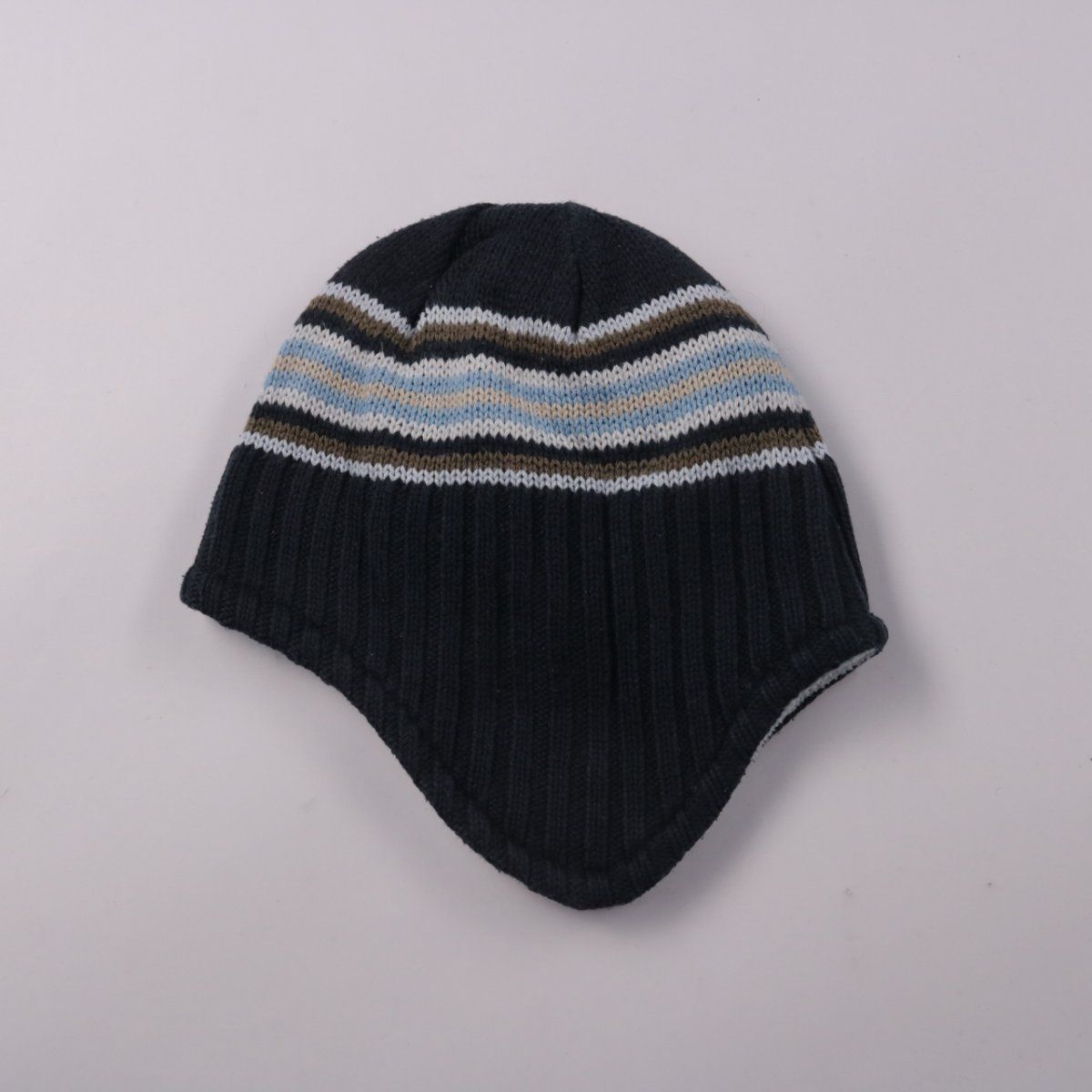 Вязаная шапка-ушанка в тёмном цвете с полосатым узором и удлинёнными «ушками». Подойдёт для зимних прогулок и активного отдыха в холодную погоду. Мягкая подкладка делает её тёплой и комфортной в носке.