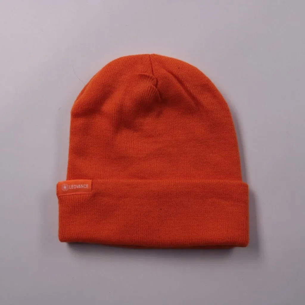 Вязаная шапка LEDVANCE ярко-оранжевого цвета с отворотом и небольшим фирменным ярлыком. Подойдёт для повседневной носки в холодную погоду и прогулок на улице. Эластичный трикотаж хорошо тянется и комфортно сидит на голове.
