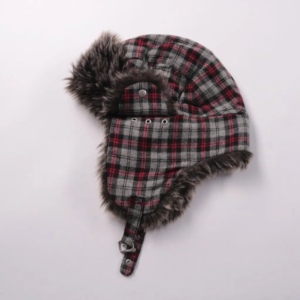 Шапка-ушанка H&M в серо-красную клетку с меховой отделкой и ушками. Подойдёт для холодной погоды и прогулок на улице, ушки можно зафиксировать ремешком. Плотный материал и меховая окантовка хорошо защищают от ветра.