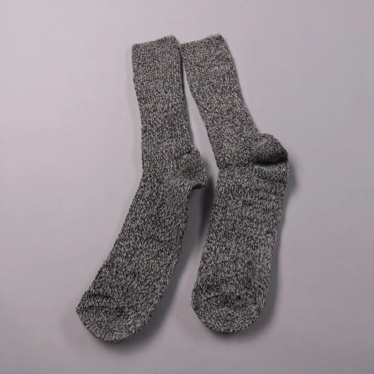 Вязаные носки серого меланжа без видимого бренда, средней/плотной вязки. Подойдут для холодной погоды и повседневной носки с ботинками или кроссовками. Плотная пряжа помогает лучше сохранять тепло.