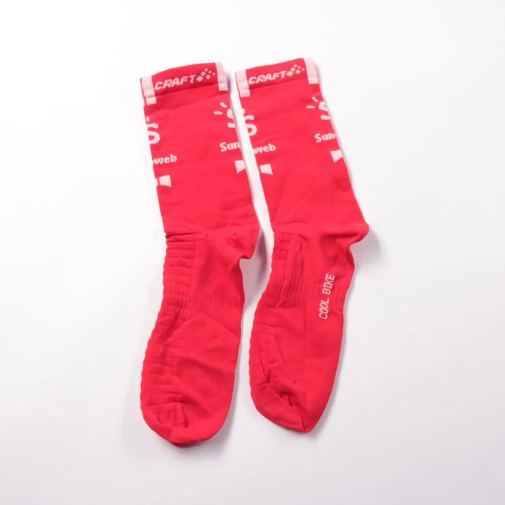 Спортивные носки Craft для велотренировок, красного цвета с принтом. Подойдут для активных поездок и тренировок в тёплую погоду благодаря тонкой дышащей вязке. Эластичная манжета хорошо держит носок на ноге и не сползает.