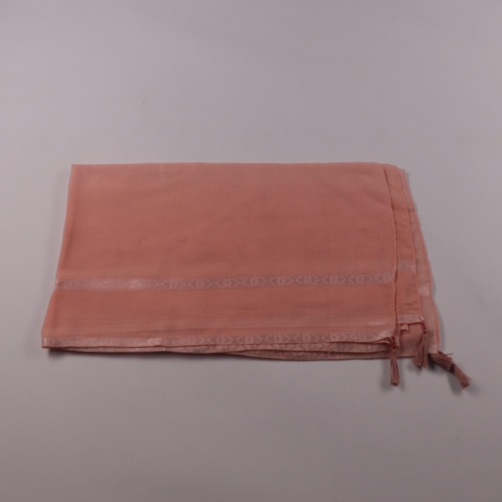 Лёгкий шарф-палантин нежного персикового цвета с светлой вставкой и декоративными кисточками по краю. Подойдёт для повседневных образов и как накидка в помещении или в прохладный вечер. Тонкая ткань компактно складывается и удобно помещается в сумку.