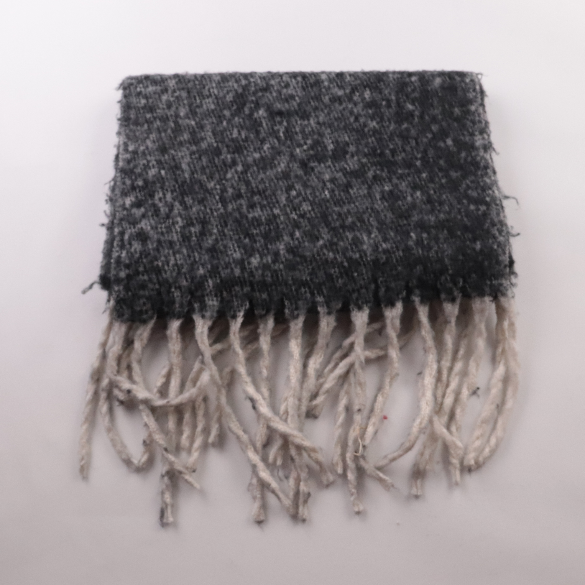 Шарф без указанного бренда, серо-чёрный с бахромой. Подойдёт для повседневных образов в прохладную погоду и как дополнительный слой на осень/весну. Лёгкий уход: 100% полиэстер, быстро сохнет.