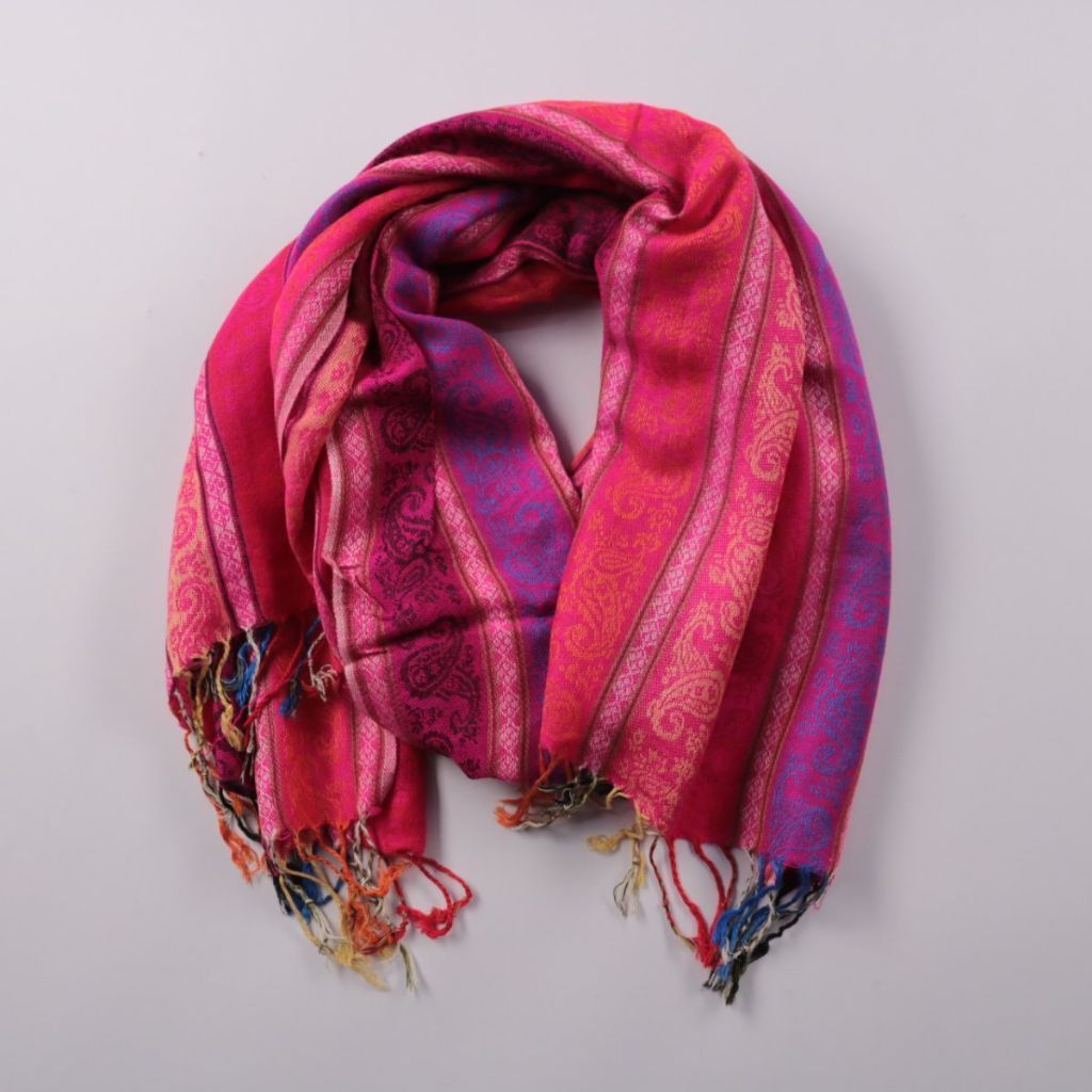 Тканый шарф с бахромой и узором в полоску, без указанного бренда. Подойдёт для повседневных образов в прохладную погоду и как акцент к однотонной одежде. Лёгкий и компактный, удобно носить в сумке.