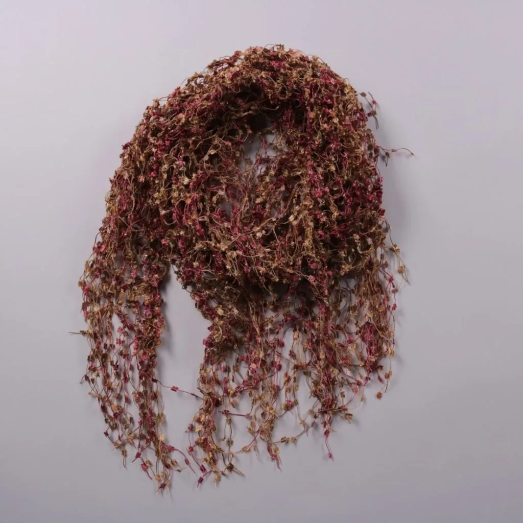 Ажурный шарф-сетка с декоративной бахромой и фактурными узелками в бордово-коричневой гамме. Подойдёт для демисезонных образов и как акцент к пальто, куртке или джемперу. Лёгкий и компактно складывается, удобно брать с собой.