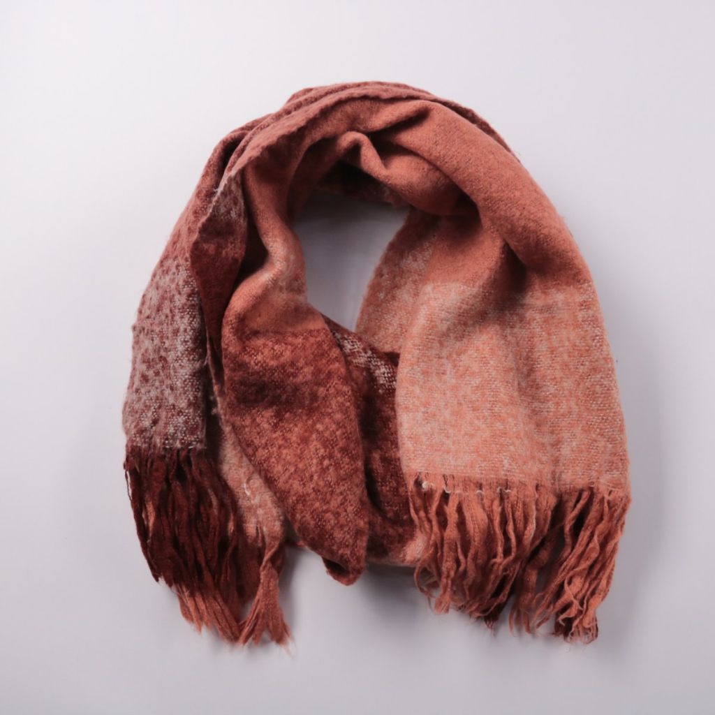 Шарф с бахромой в клетку, в тёплой коричнево-розовой гамме. Подойдёт для повседневных образов в прохладную погоду и легко сочетается с пальто или курткой. Длинное полотно удобно драпируется и можно завязывать разными способами.