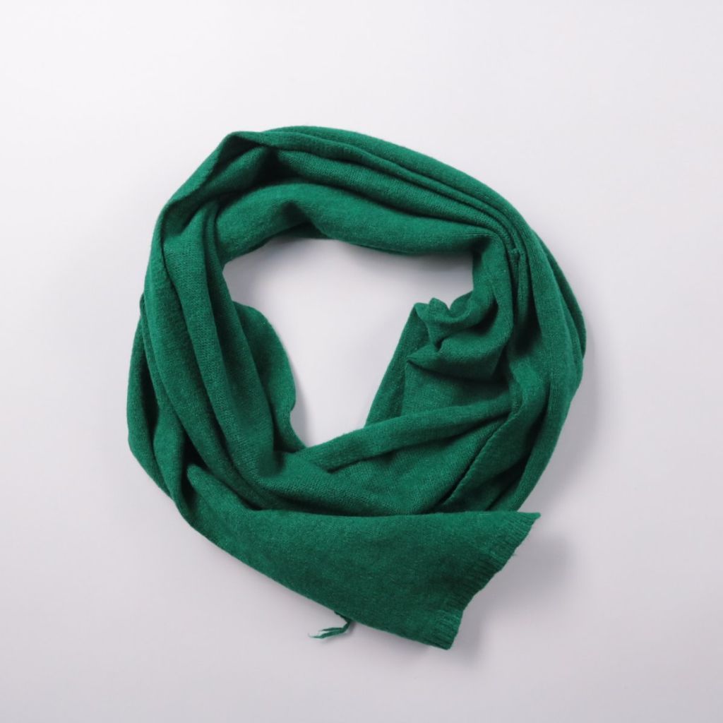 Зелёный шарф без видимых логотипов, мягкий на ощупь и хорошо драпируется. Подойдёт для прохладной погоды в городе и на прогулках, легко сочетается с базовой верхней одеждой. Удобно носить в сумке — занимает мало места и быстро добавляет тепла.