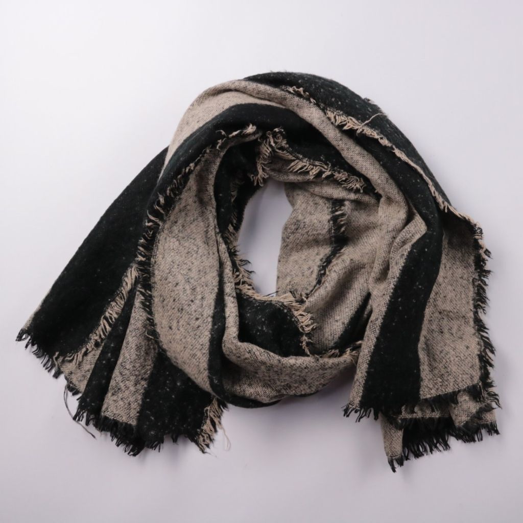 Шарф в черно-серую полоску с бахромой по краям. Подойдёт для повседневных образов и на прохладную погоду в межсезонье. Легко сочетать с верхней одеждой благодаря нейтральной гамме.
