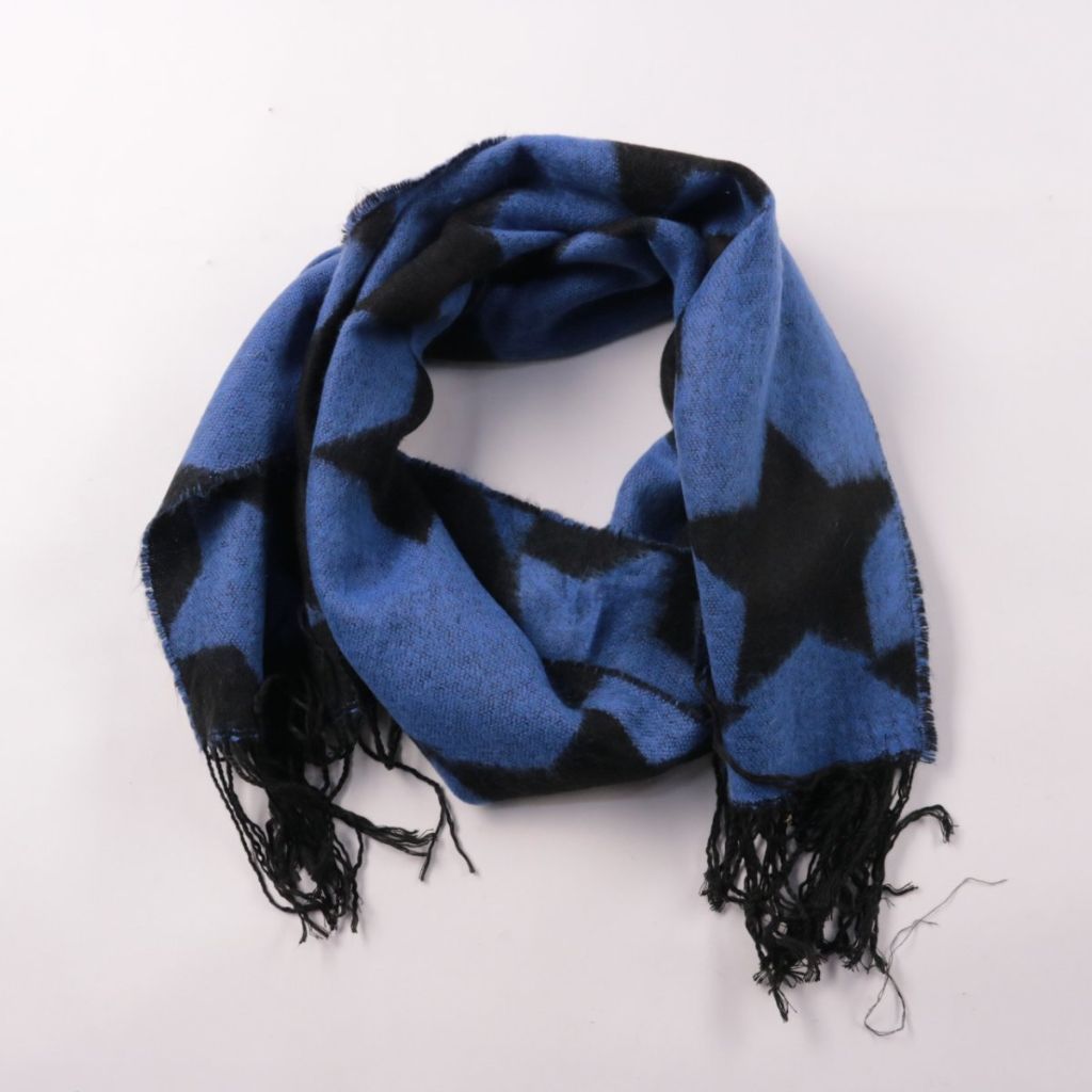 Шарф с бахромой в сине-чёрной гамме и принтом со звёздами. Подойдёт для повседневных образов в прохладную погоду, можно носить с пальто или курткой. Мягкий материал хорошо драпируется и добавляет тепла у шеи.