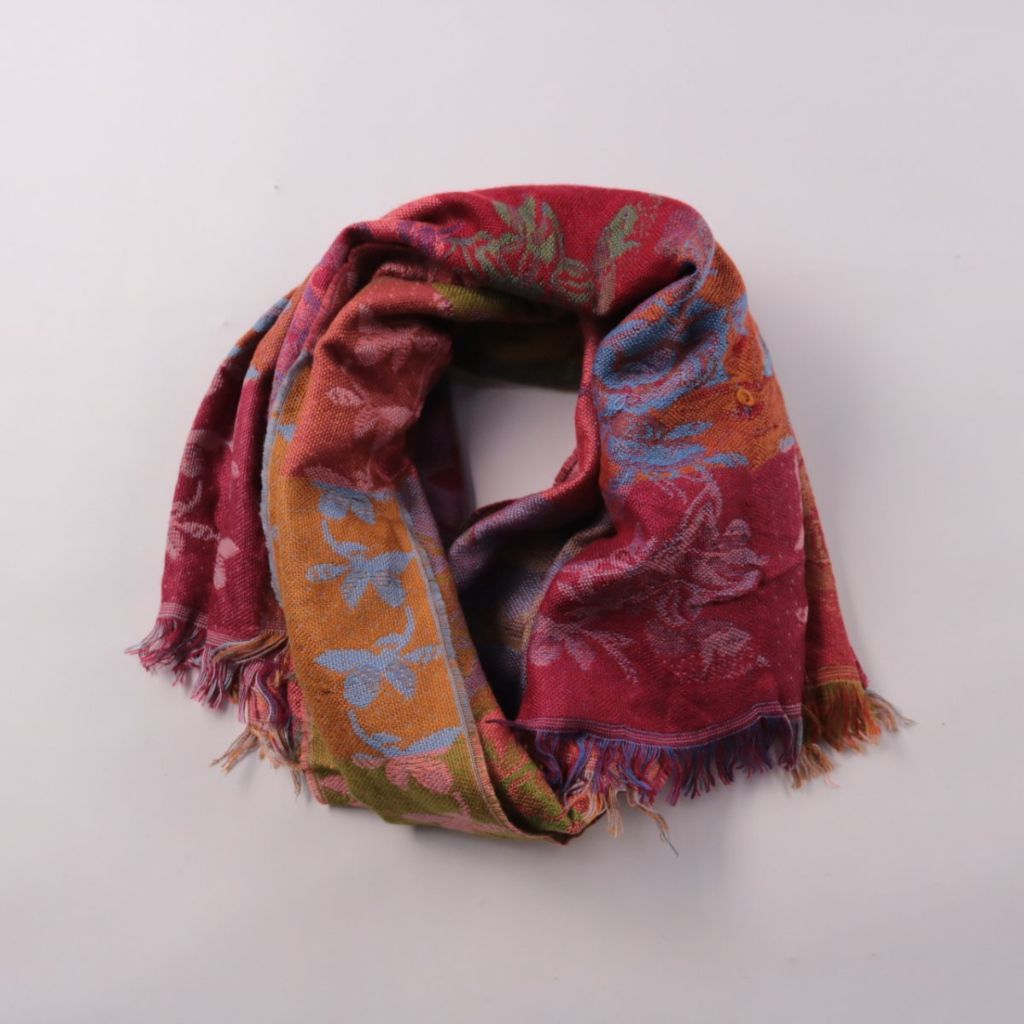 Шарф с бахромой и тканым цветочным узором в разноцветных блоках. Подойдёт для повседневных образов и в поездки в прохладную погоду. Хорошо драпируется и добавляет цветовой акцент без лишнего объёма.