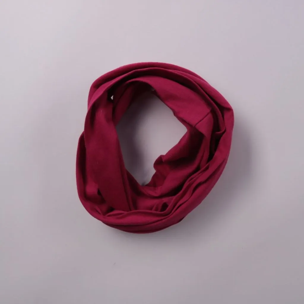 Бордовый шарф-снуд без бренда, выполнен из мягкого тонкого трикотажа. Подойдёт для повседневной носки в прохладную погоду и как лёгкий аксессуар к куртке или пальто. Удобно надевается через голову и не развязывается при движении.
