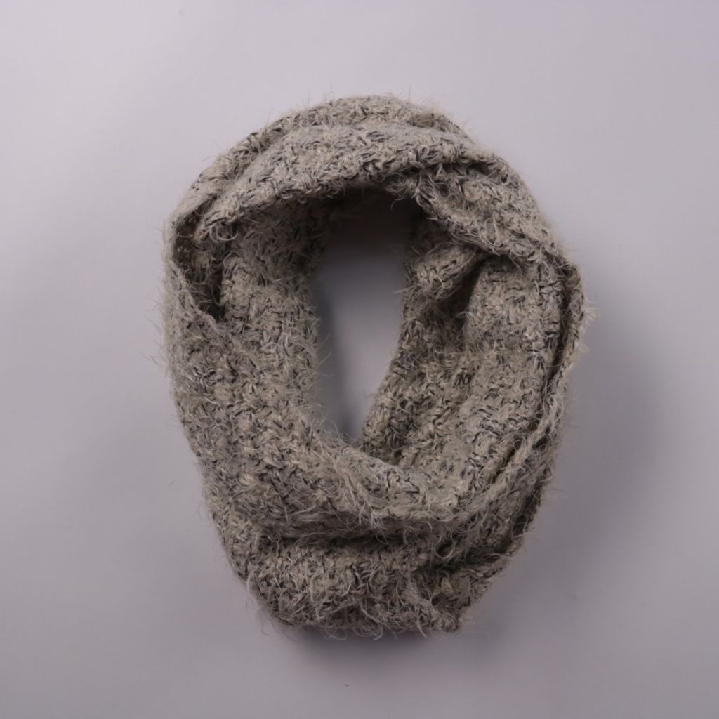 Вязаный шарф-снуд из фактурной пушистой пряжи серого цвета. Подойдёт для повседневной носки в холодную погоду, хорошо сочетается с пальто и пуховиком. Удобен тем, что надевается одним движением и плотно закрывает шею от ветра.