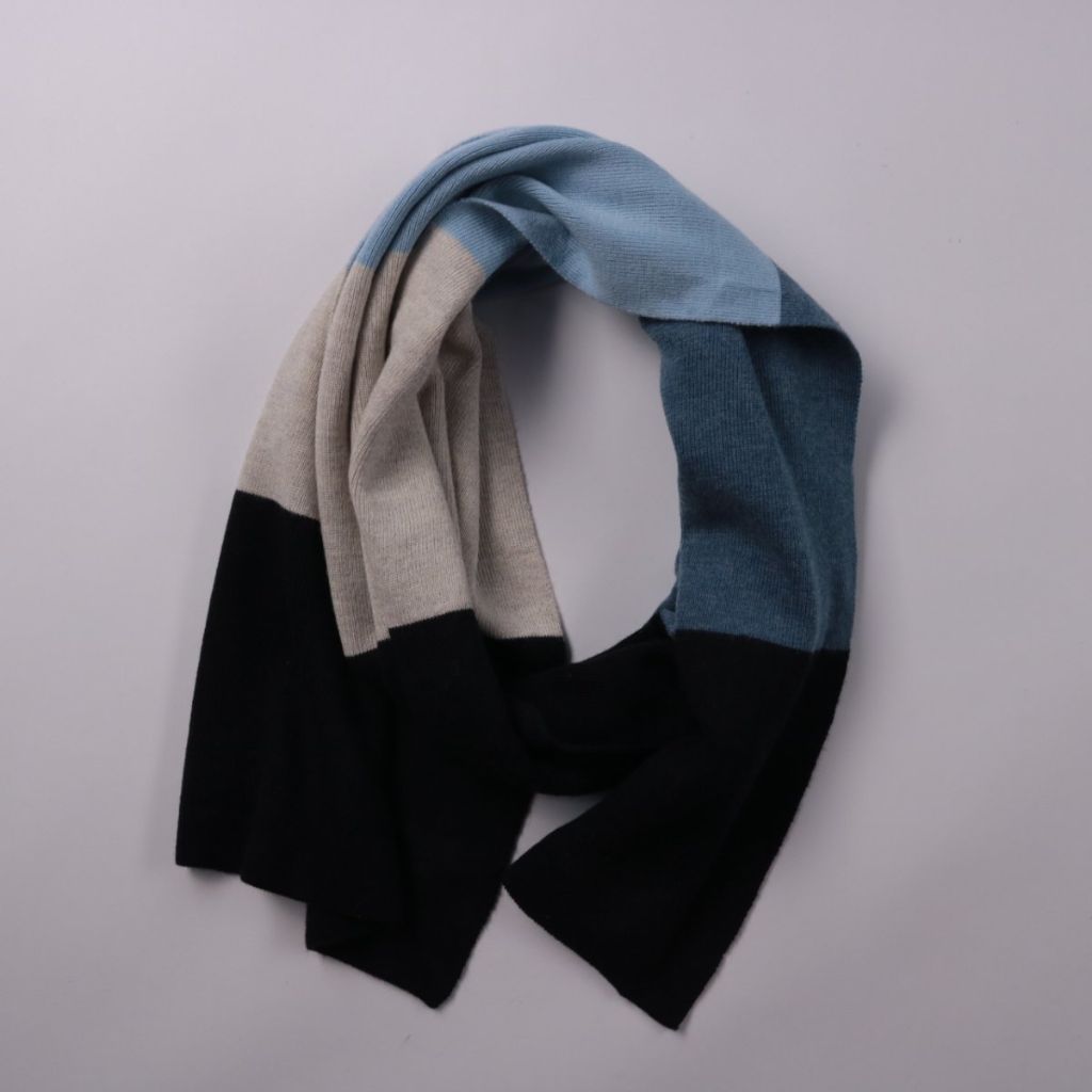 Трикотажный шарф без бренда в цветовых блоках (чёрный, серый и голубой). Подойдёт для повседневной носки в холодную погоду и легко сочетается с базовой верхней одеждой. Смесь шерсти с полиакрилом делает его тёплым и менее прихотливым в уходе.