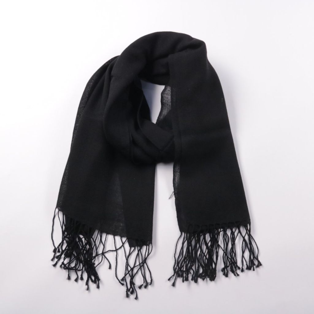 Чёрный шарф с бахромой по краю, лаконичный и легко сочетается с базовым гардеробом. Подойдёт для повседневных образов и поездок, чтобы утеплиться или добавить акцент. Благодаря лёгкой ткани удобно носить и компактно складывать в сумку.