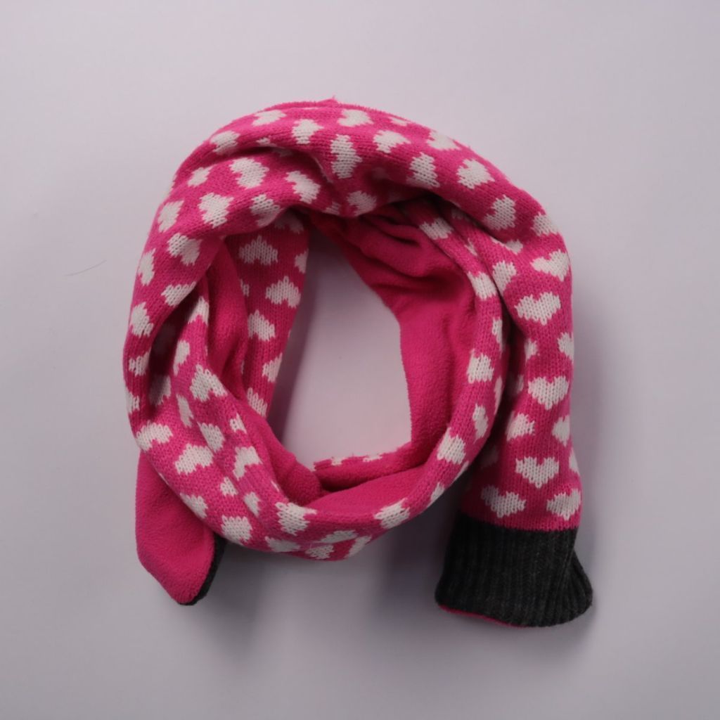 Вязаный шарф с узором в белые сердечки на розовом фоне и контрастным тёмным краем. Подойдёт для зимних прогулок и повседневных образов, добавляя яркий акцент. Мягкая подкладка помогает лучше сохранять тепло и делает шарф комфортным к коже.