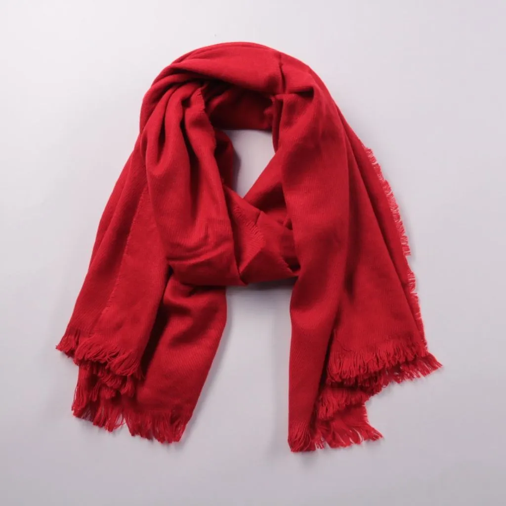 Шарф красного цвета с бахромой по краям, без видимых логотипов бренда. Подойдёт для повседневных образов в прохладную погоду и удобно драпируется на шее или на плечах. Практичный плюс — большой размер позволяет носить его как палантин.