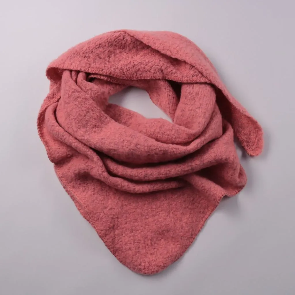 Тёплый шарф- платок без бренда, выполнен из мягкого фактурного трикотажа в розовом оттенке. Подойдёт для прохладной погоды и легко драпируется поверх пальто или куртки. Практичен тем, что хорошо закрывает шею и грудь за счёт треугольной формы.