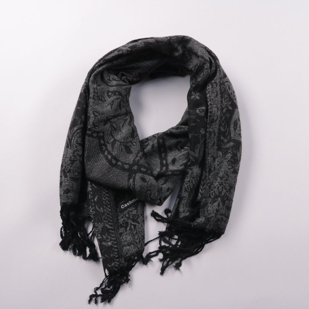 Шарф с жаккардовым узором и бахромой, на бирке указано Cashmere. Подойдёт для повседневных образов и поездок в холодную погоду. Мягкий материал хорошо сохраняет тепло и удобно драпируется.