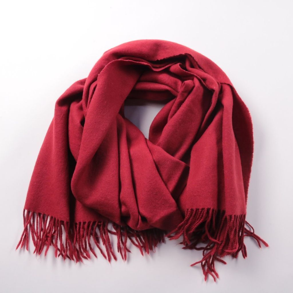 Шарф насыщенного бордового цвета с кисточками по краю, без видимых логотипов. Подойдёт для повседневных образов в холодное время года и легко сочетается с пальто или пуховиком. Хорошо защищает шею от ветра за счёт плотной ткани и большой длины.