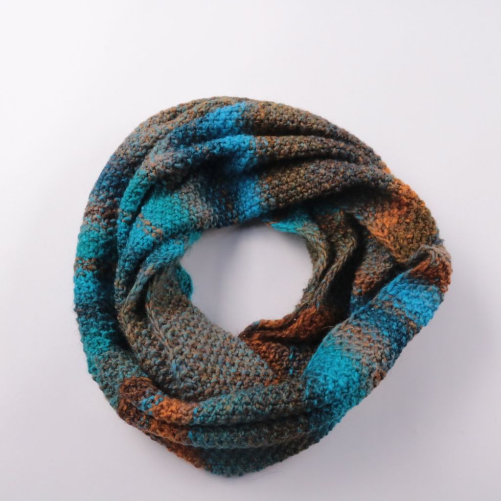 Вязаный снуд без бренда, выполнен из фактурной пряжи в полоску. Подойдёт для повседневной носки в холодную погоду, хорошо сочетается с куртками и пальто. Удобен тем, что надевается одним движением и не развязывается как обычный шарф.