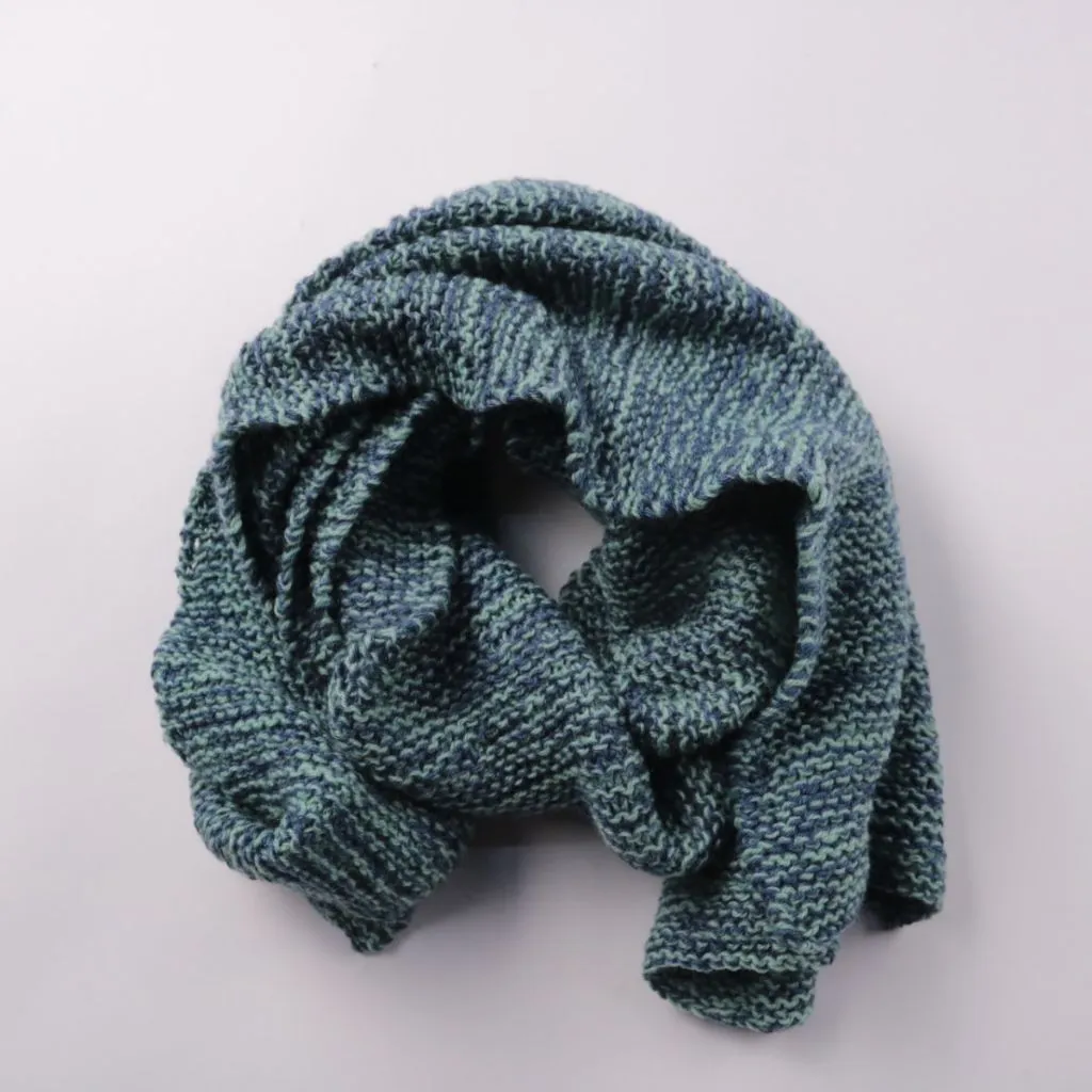 Вязаный шарф без бренда в голубовато-синем меланже, плотной фактуры. Подойдёт для зимних прогулок и повседневных образов, хорошо сочетается с верхней одеждой в спокойных оттенках. Практичное преимущество — мягкий объёмный трикотаж сохраняет тепло и ком...