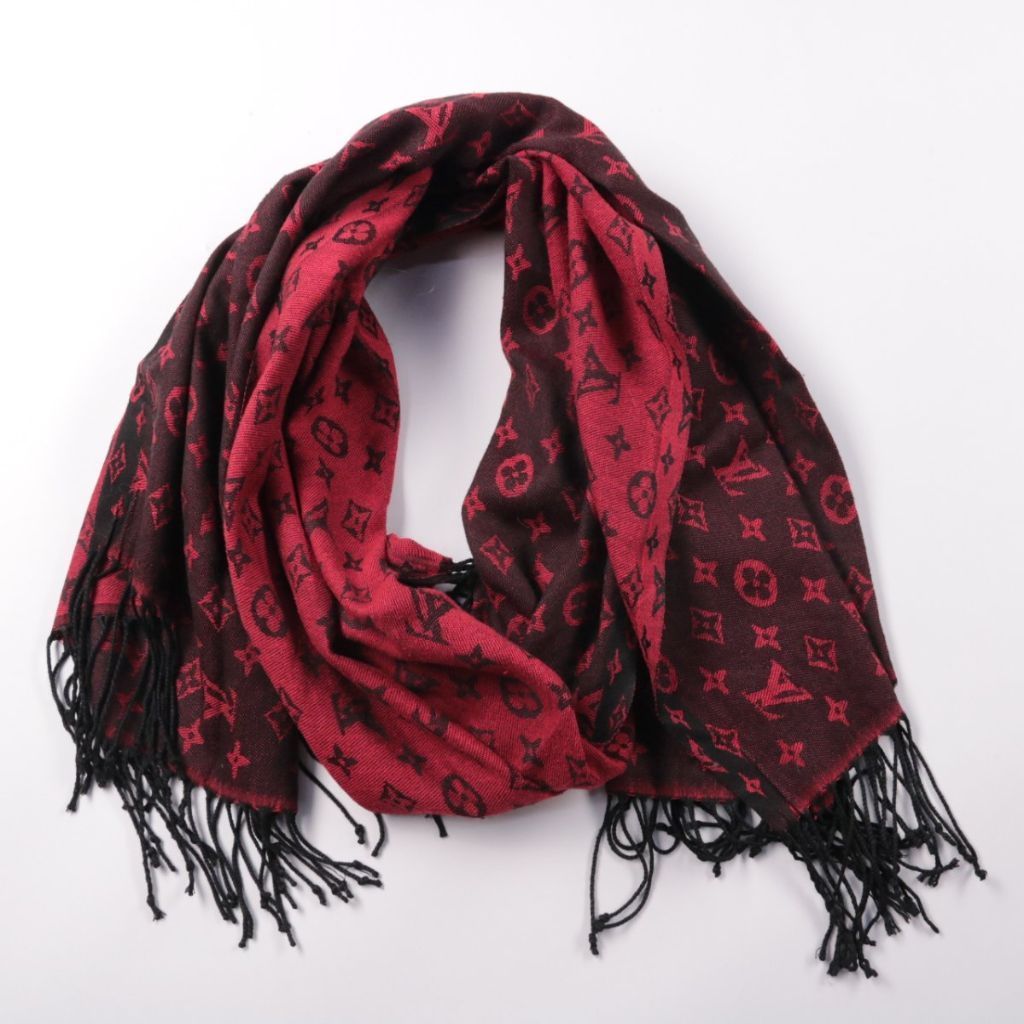 Шарф с бахромой и двусторонним жаккардовым узором в бордово-чёрной гамме. Подойдёт для повседневных образов в прохладную погоду и как акцент к однотонной верхней одежде. Мягко драпируется и удобно регулируется по длине за счёт объёма полотна.