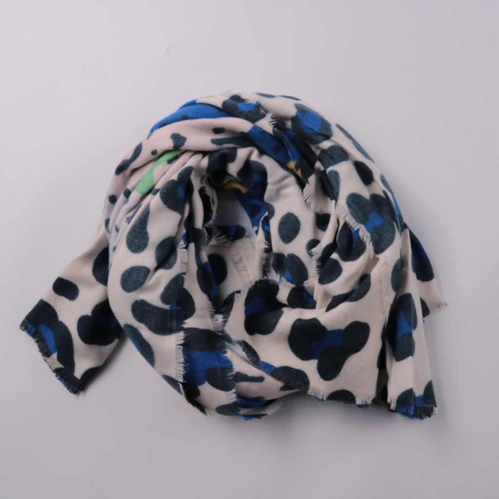 Лёгкий шарф с принтом в горошек/пятна и контрастными полосами по краю. Подойдёт для повседневных образов и как акцент к однотонной верхней одежде. Тонкая ткань удобно драпируется и не занимает много места в сумке.