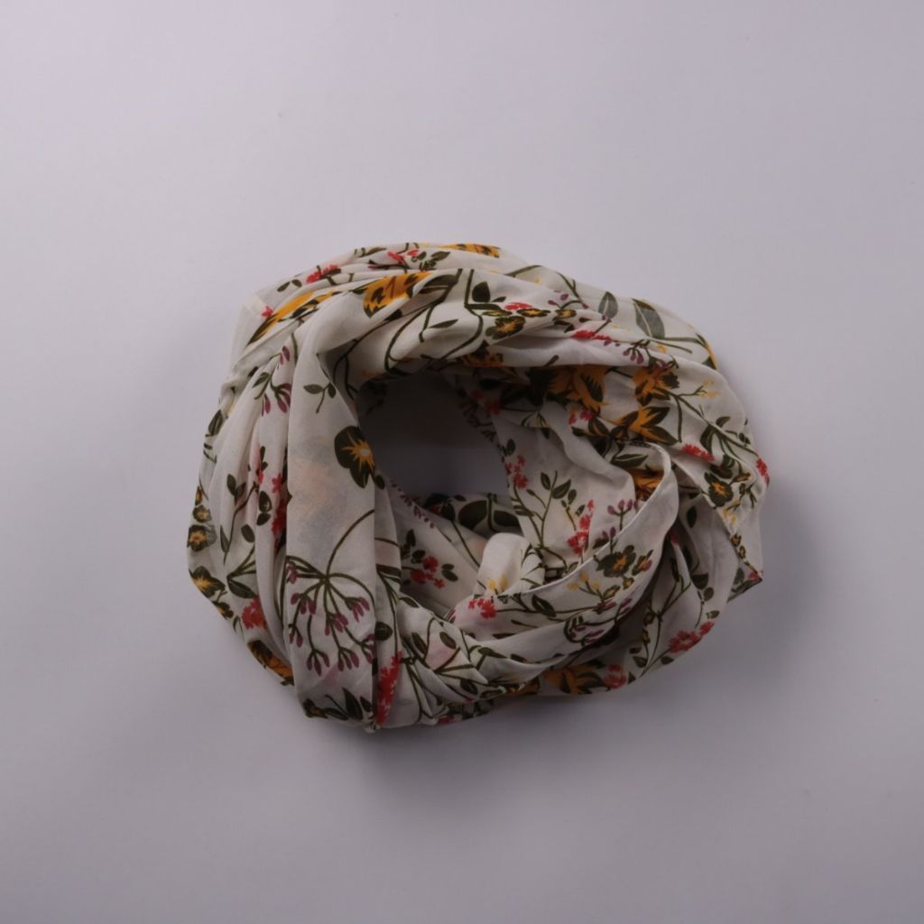 Платок Pieces светлого цвета с цветочным принтом. Подойдёт для повседневных образов и как лёгкий акцент на шею или в волосы в тёплое время. Тонкая ткань легко складывается и удобно помещается в сумку.