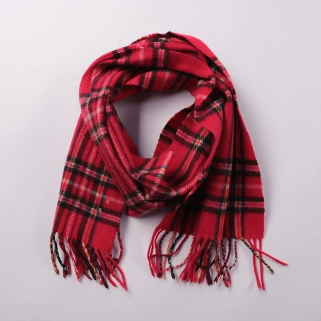 Шарф в красную клетку с бахромой по краям, бренд не указан. Подойдёт для повседневной носки в холодную погоду, хорошо смотрится с пальто и куртками. Длинный формат позволяет завязывать разными способами и плотнее закрывать шею от ветра.