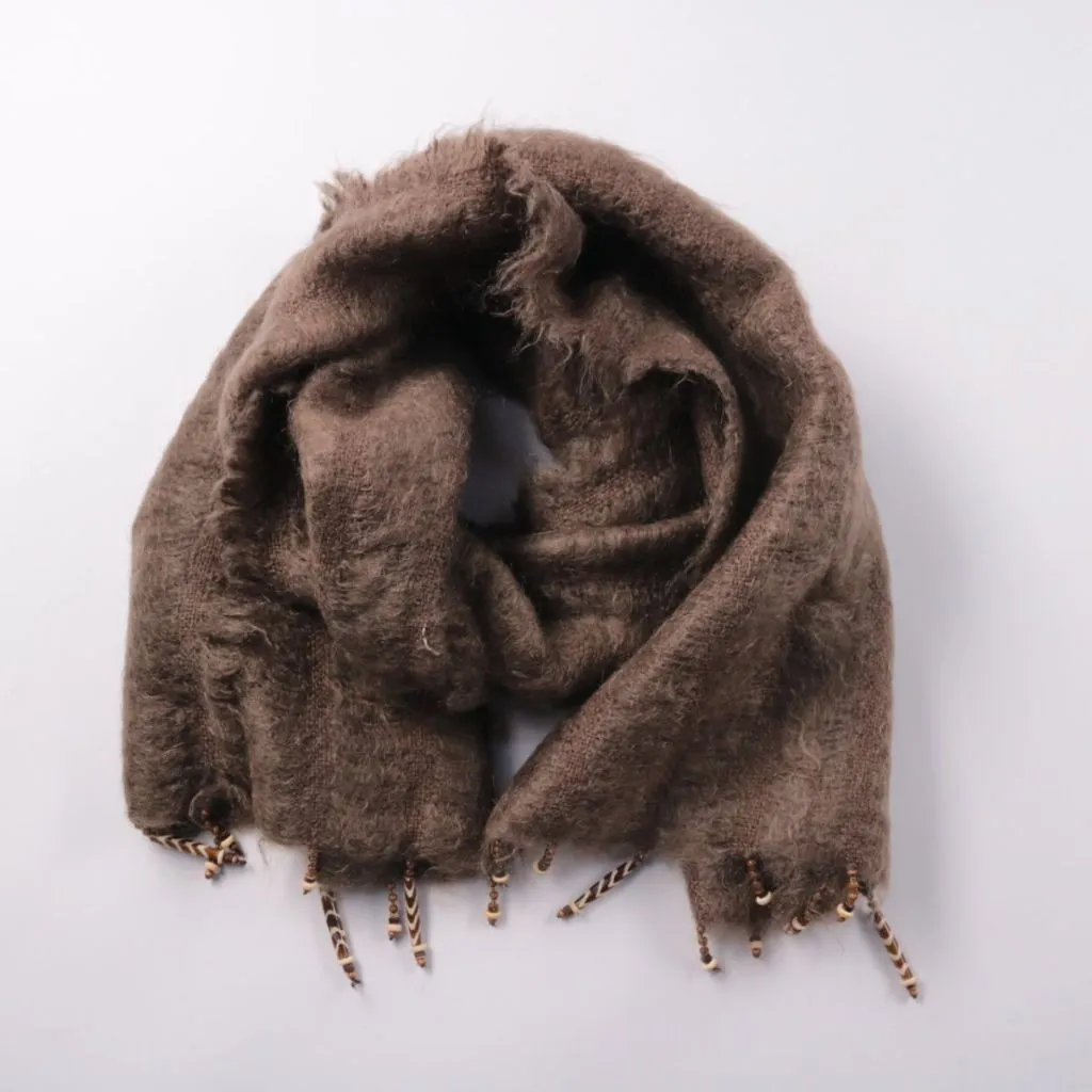 Тёплый объёмный шарф без указанного бренда, коричневого цвета, с декоративной бахромой и бусинами по краю. Подойдёт для зимних прогулок и поездок, можно носить как шарф или накинуть на плечи. Мягкая фактура хорошо защищает от ветра и добавляет образу а...