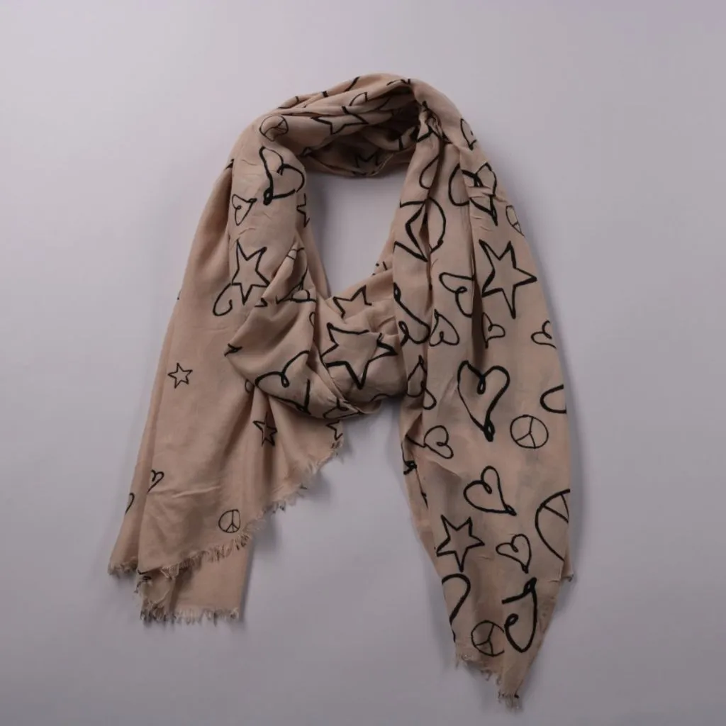Шарф Taifun бежевого цвета с чёрным принтом (сердца, звёзды и символы peace), края с лёгкой бахромой. Подойдёт для повседневных образов и как акцент к однотонной верхней одежде в демисезон и прохладные летние вечера. Лёгкий материал удобно драпируется ...