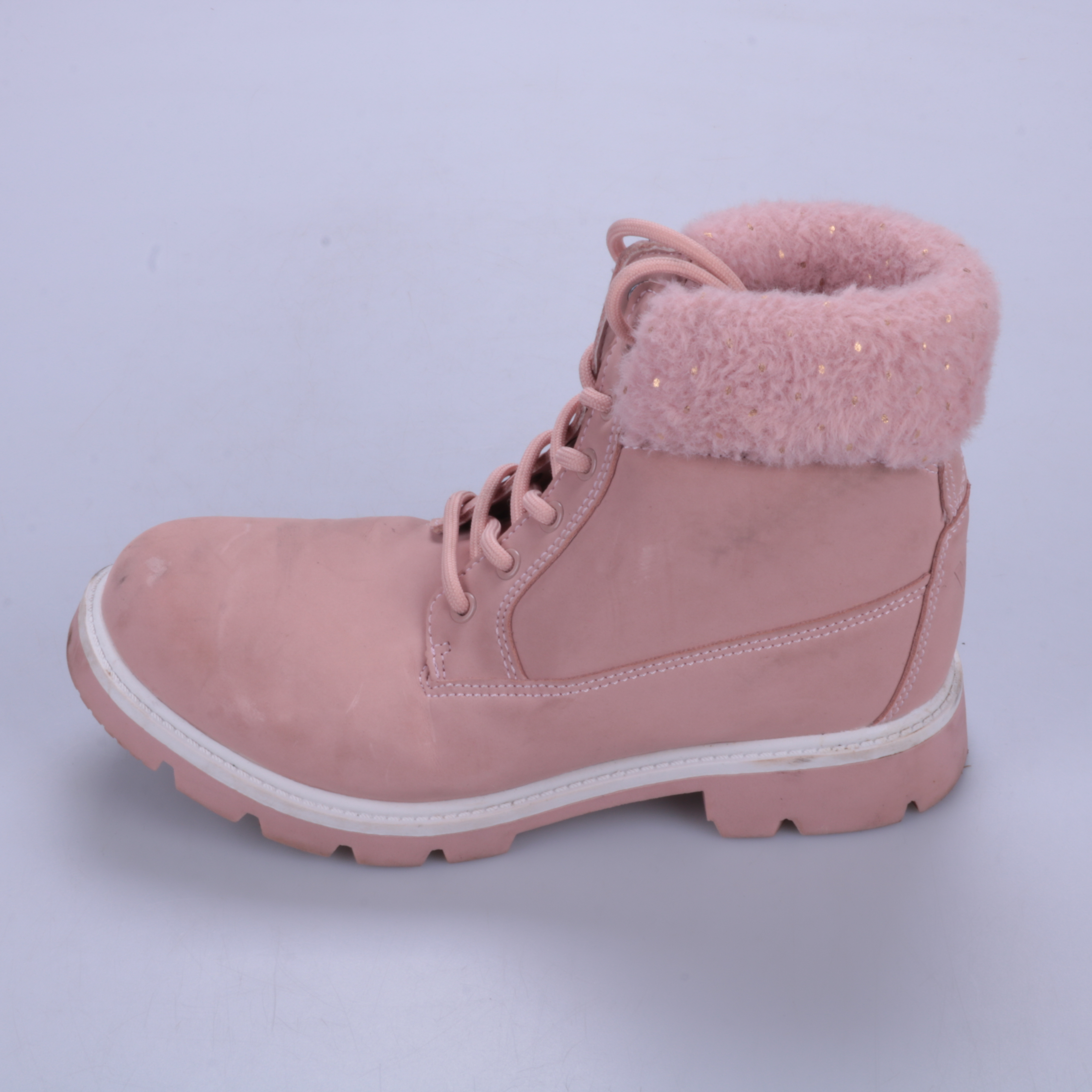 Детские ботинки Vty в розовом цвете, на шнуровке и с мягким утеплённым верхом по краю голенища. Подойдут для прогулок в прохладную погоду весной и осенью. Рифлёная подошва даёт более уверенное сцепление на улице.