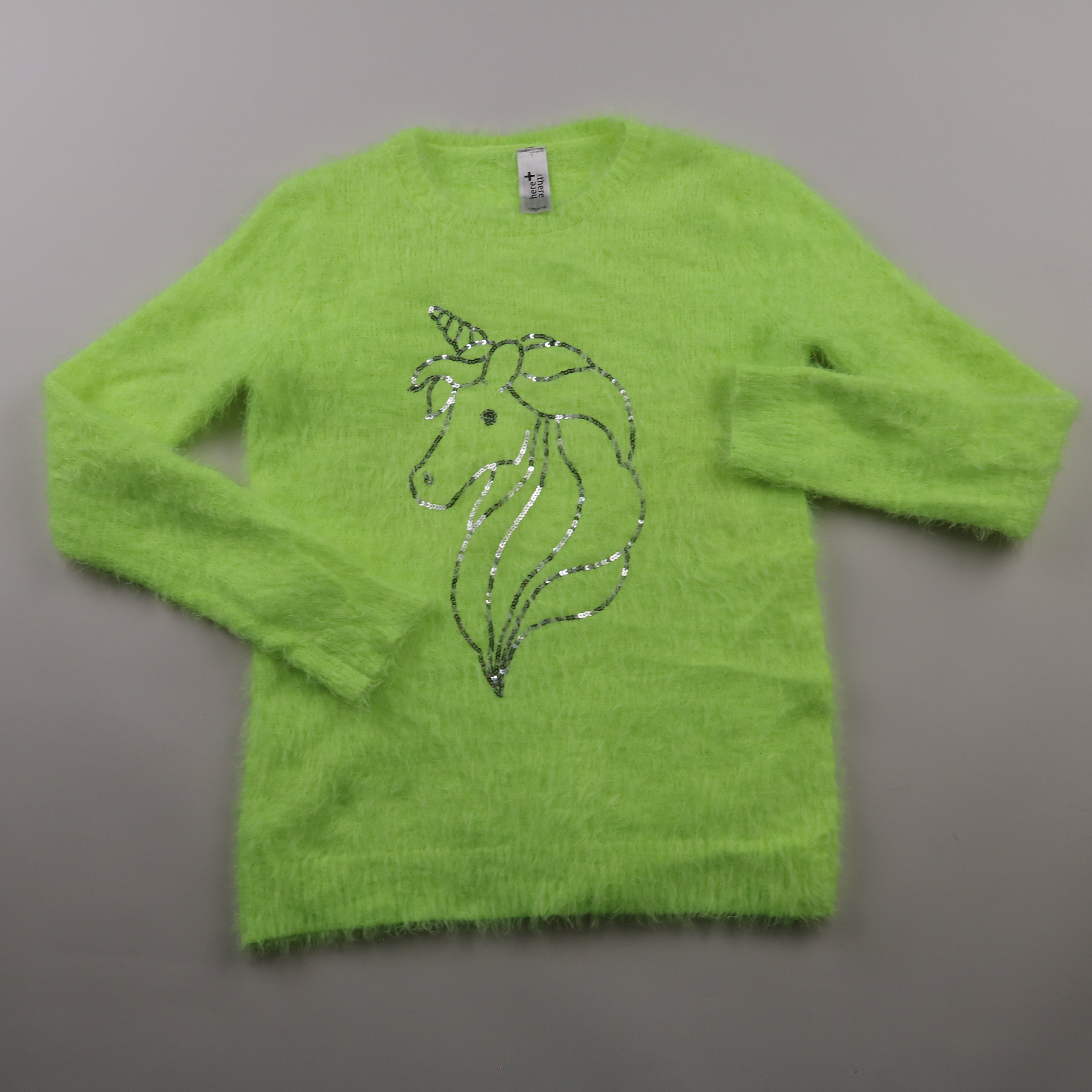 Пушистый свитер C&A here+there ярко‑зелёного цвета с рисунком единорога из пайеток. Подойдёт для школы и прогулок в прохладную погоду, легко сочетается с джинсами и юбками. Мягкая фактура приятна к телу и хорошо сохраняет тепло.