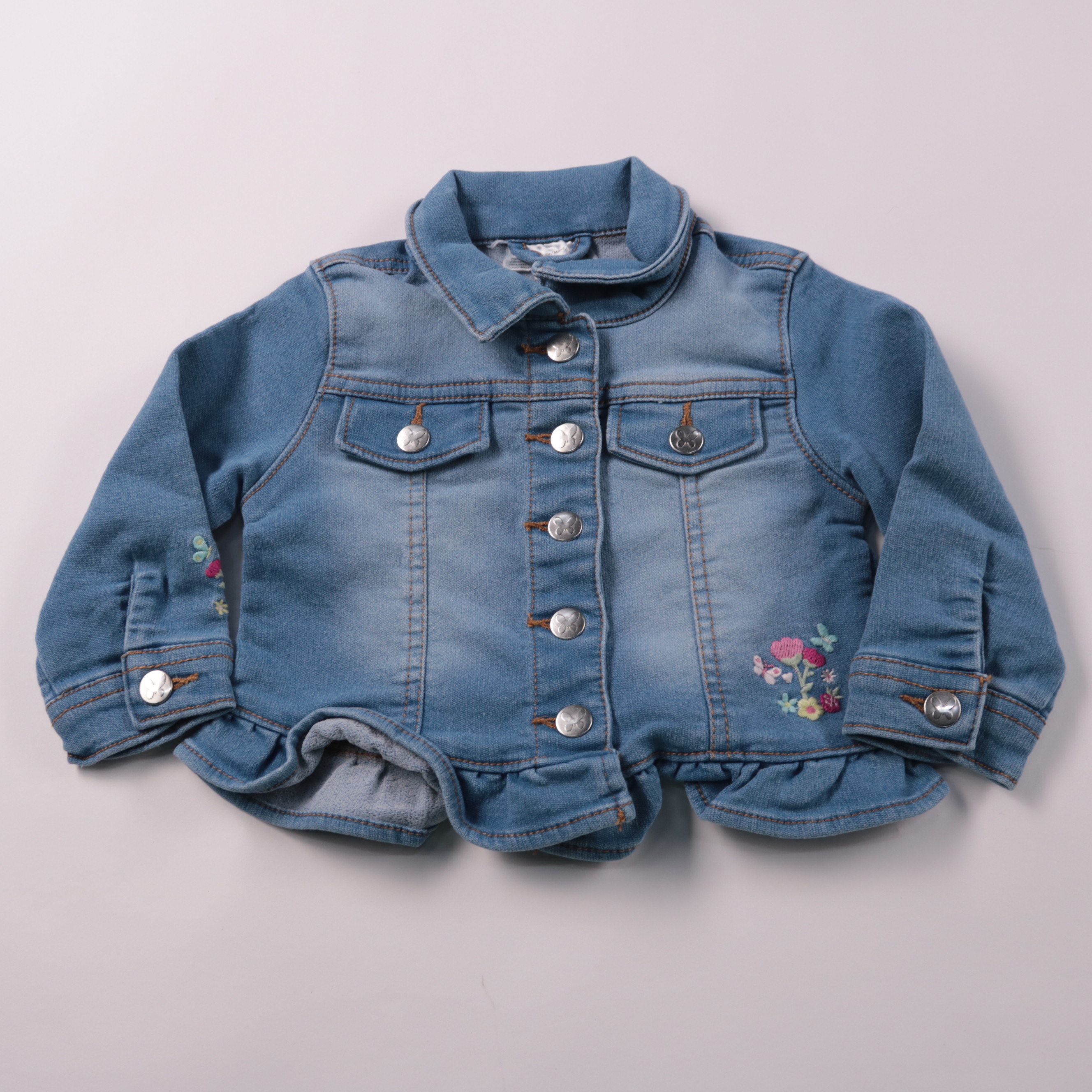 Джинсовка Okaidi для девочки из мягкого денима с вышивкой и воланом по низу. Подойдёт для прохладной весны/осени и летних вечеров, удобно носить поверх платья или футболки. Практичный вариант на каждый день: легко застёгивается на кнопки и сочетается с...