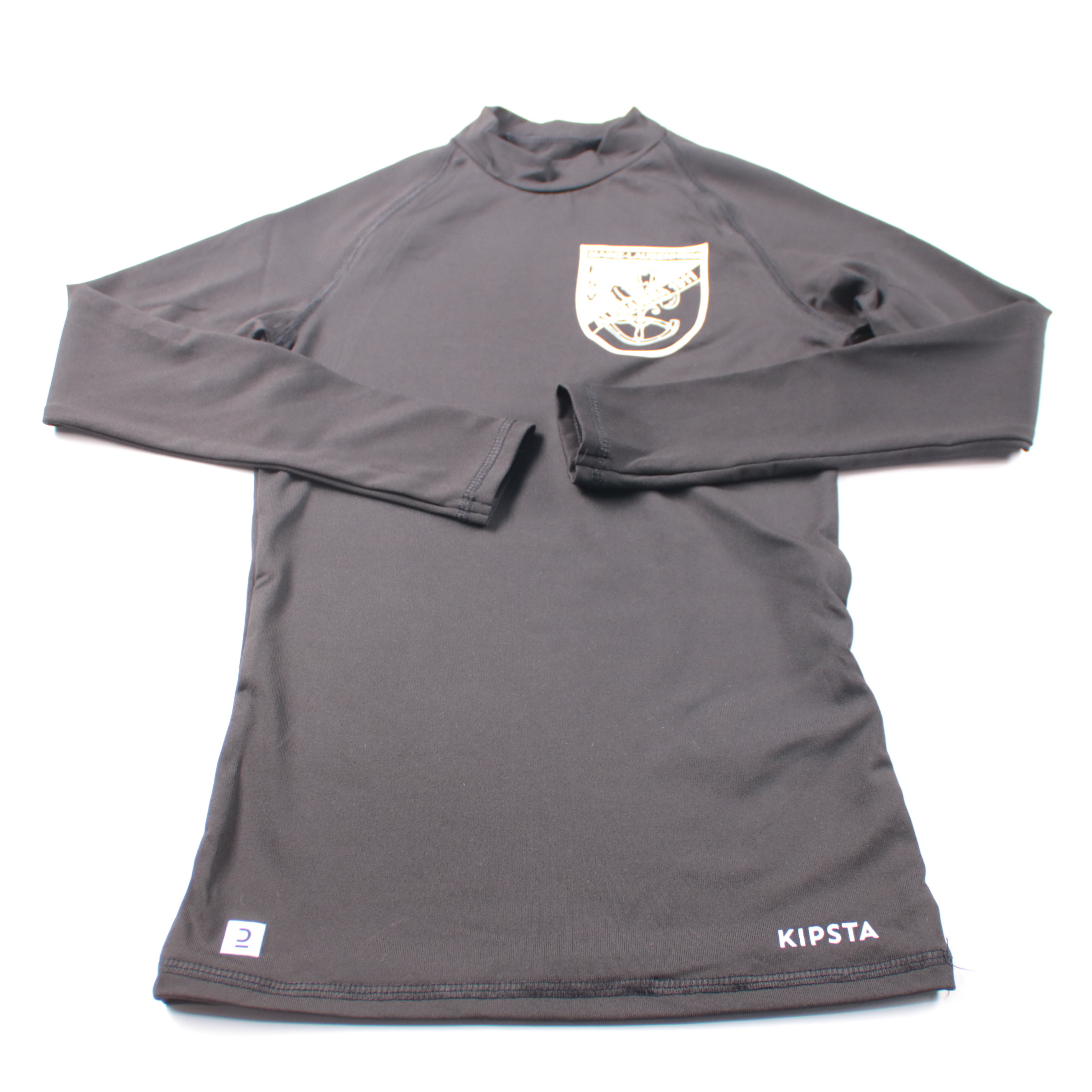 Лонгслив Kipsta (Decathlon) чёрного цвета из эластичной спортивной ткани с высоким воротником и эмблемой на груди. Подойдёт для тренировок и активных игр в зале или на улице в прохладную погоду как базовый слой. Материал тянется и быстро сохнет, поэтом...