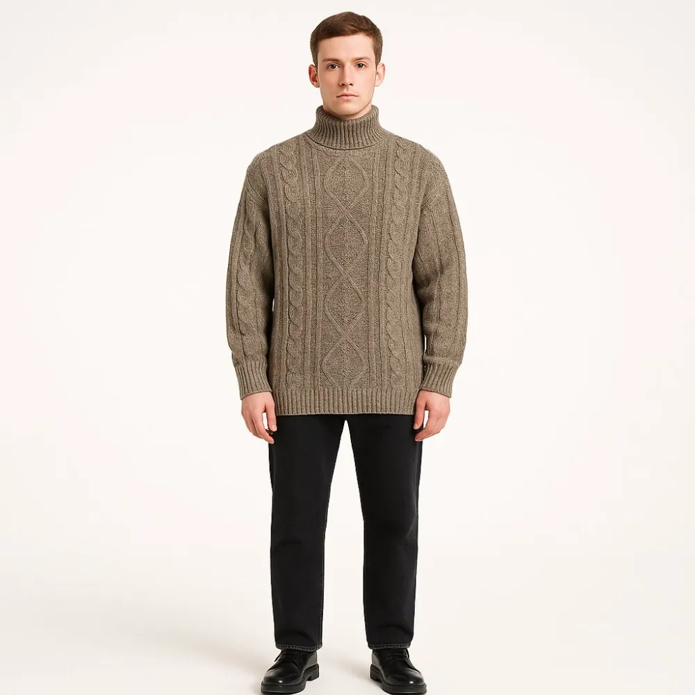 Мужской вязаный свитер Caniba с высоким воротником и узором «косы». Подойдёт для прохладной погоды и носки в городе, хорошо сочетается с джинсами и брюками. Плотная вязка лучше держит тепло и форму.