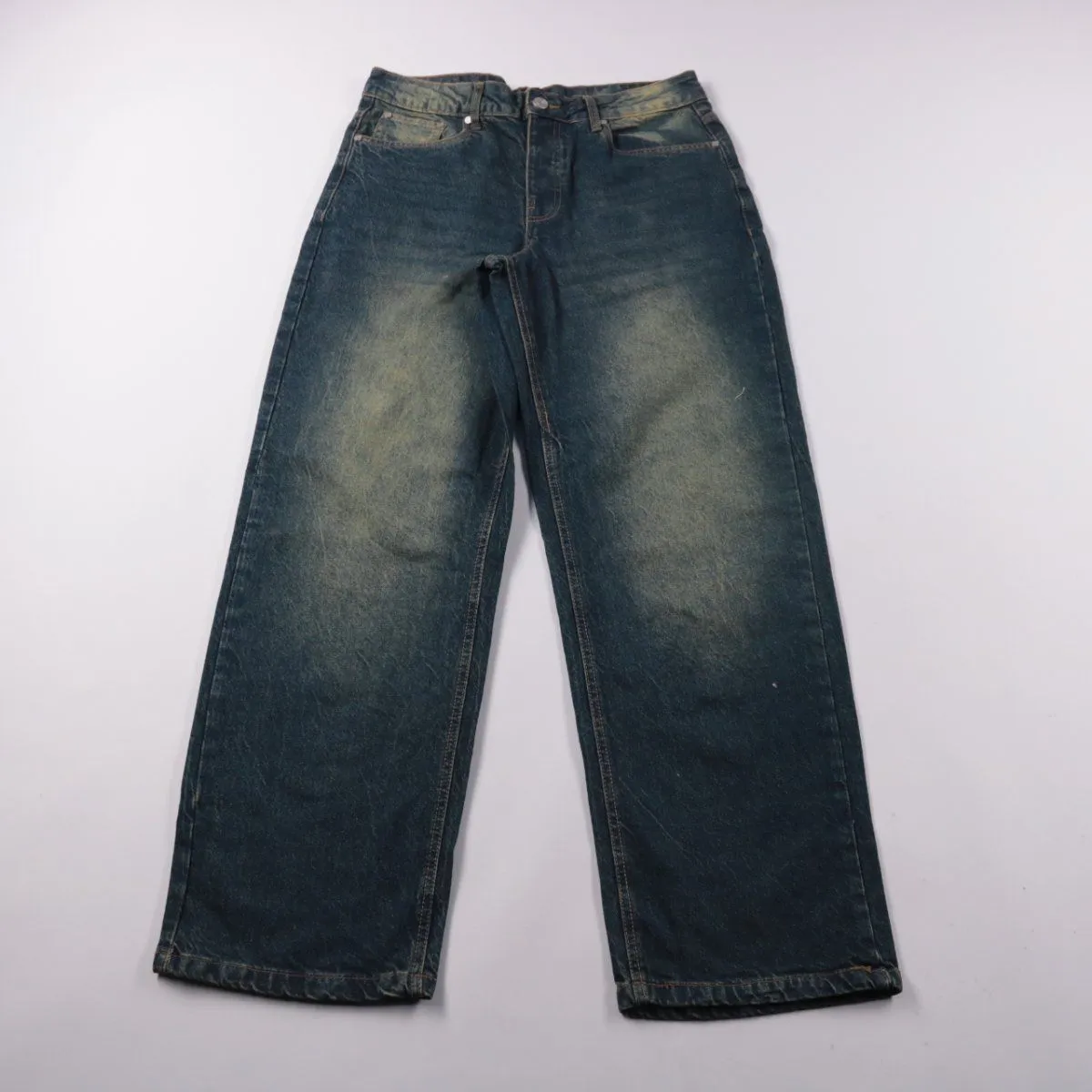 Мужские джинсы BoohooMAN из денима в синем цвете с выраженным эффектом выстиранности. Подойдут на каждый день и для casual-образов с кроссовками или ботинками. Практичный плюс — плотная ткань и удобная посадка для длительной носки.