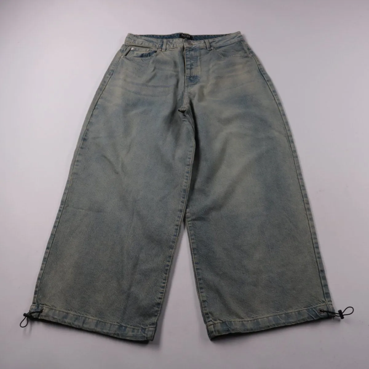 Мужские джинсы boohooMAN светло-голубого варёного оттенка, широкий крой с укороченными штанинами. Подойдут для повседневных образов в городе и на отдыхе. Утяжки по низу помогают регулировать посадку по обуви.