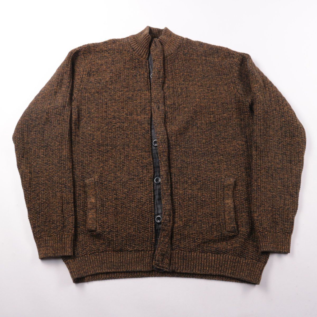 Мужской вязаный кардиган No Excess коричневого меланжа на пуговицах со стойкой и карманами. Подойдёт для повседневной носки в прохладную погоду и для офиса. Плотная вязка хорошо держит форму и даёт дополнительное тепло.