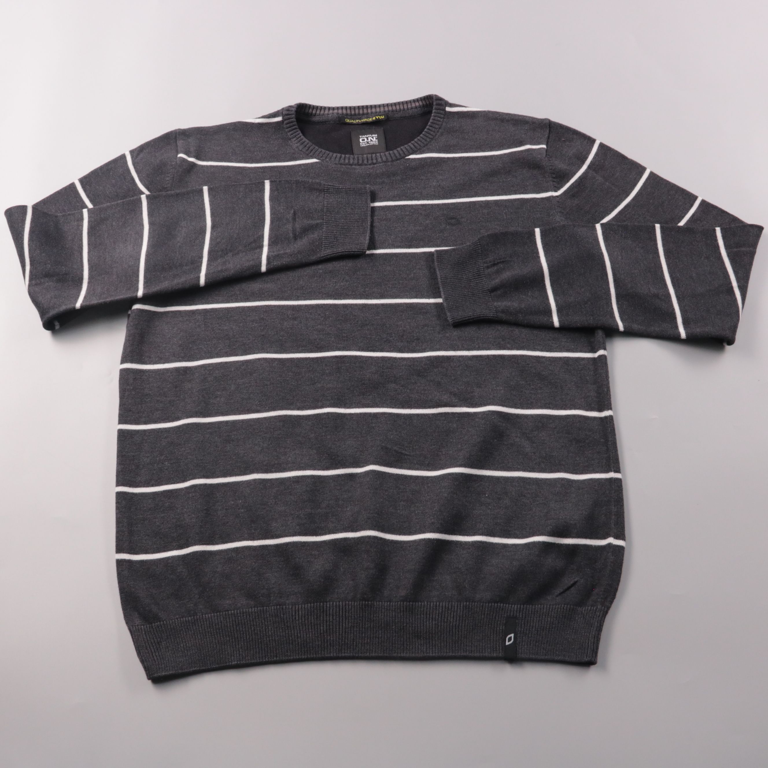 Мужской джемпер Tantum O.N. тёмно-серого цвета в белую горизонтальную полоску, с круглым вырезом и манжетами на рукавах. Подойдёт для повседневной носки и офиса в прохладную погоду. Смесь хлопка и акрила делает вещь мягкой и более практичной в уходе.