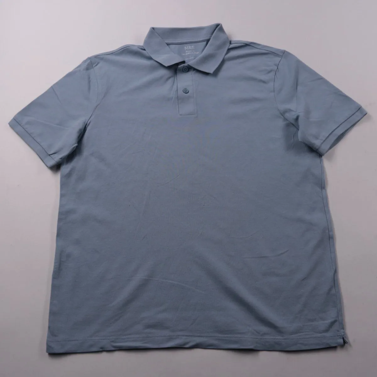 Мужское поло M&S Regular Fit (The Ultimate Polo) светло-голубого цвета, с отложным воротником и планкой на пуговицах. Подойдёт для повседневных и smart-casual образов, удобно носить с джинсами или чиносами. Ткань с эластаном слегка тянется и комфортно садится по фигуре.