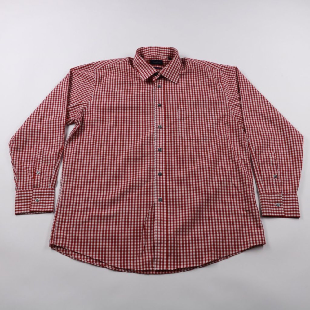 Мужская рубашка Taylor & Wright в красно-белую клетку, длинный рукав, классический воротник. Подойдёт для офиса и повседневной носки с джинсами или брюками. Ткань easy iron — проще гладить и удобно в уходе.