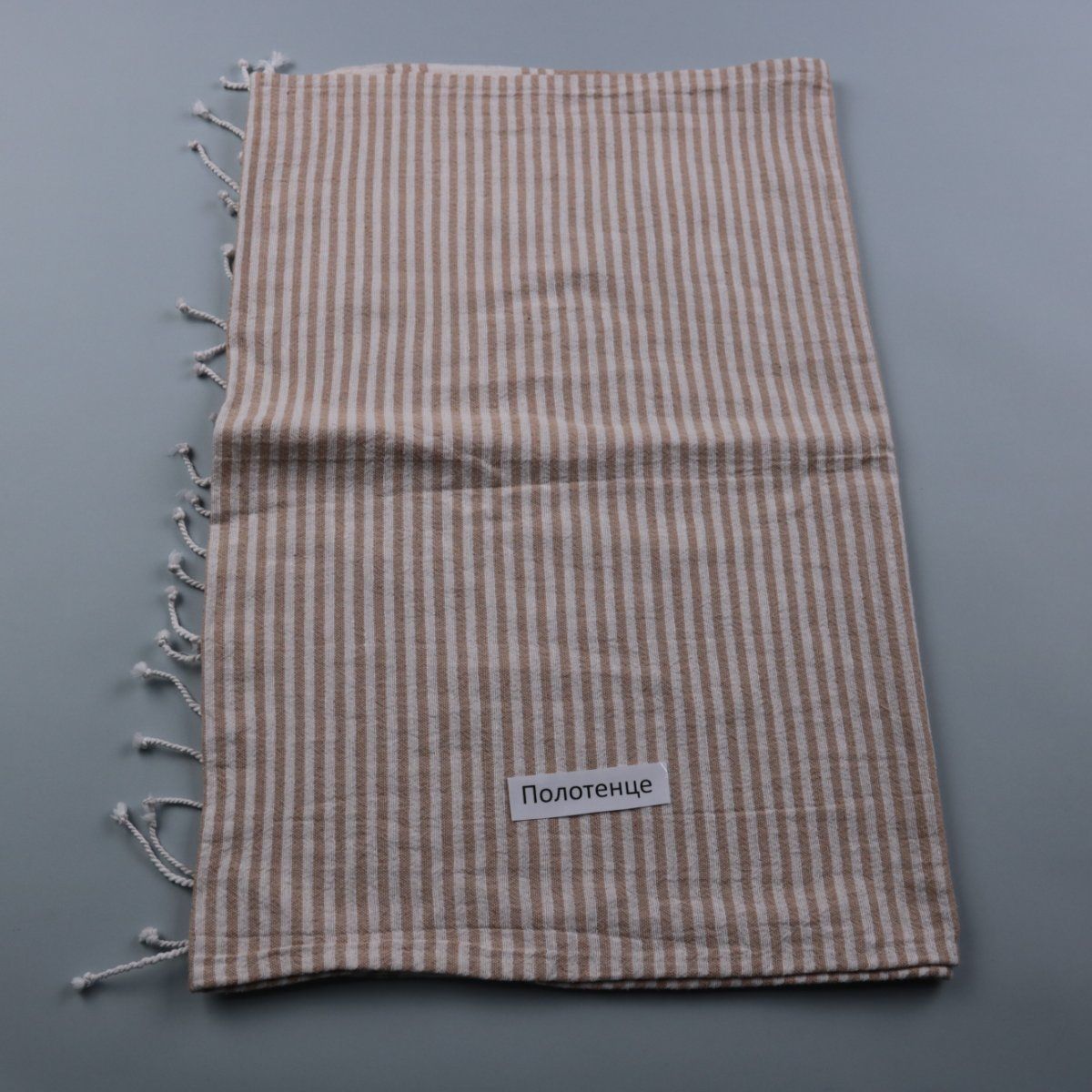 Полотенце в бежево-белую полоску с декоративной бахромой по краю. Подойдёт для ванной, сауны или пляжа, лёгкое и быстро сохнет благодаря смешанному составу.