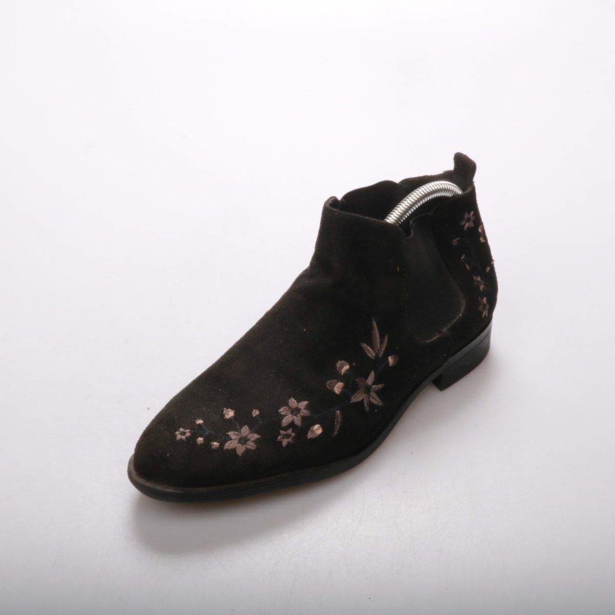Женские ботильоны из чёрной замши с вышивкой в цветочный мотив и эластичными вставками по бокам. Подойдут для повседневных образов в межсезонье — с джинсами, брюками или платьями. Удобно быстро надевать за счёт резинок и невысокого устойчивого каблука.