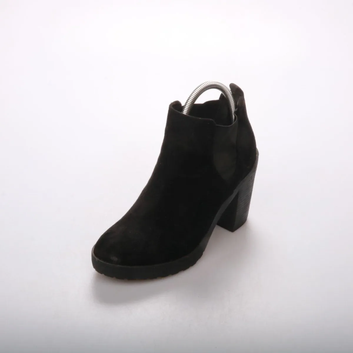 Женские черные ботильоны из замши на устойчивом каблуке, с эластичными вставками по бокам. Подойдут для повседневных образов в межсезонье с джинсами или платьями. Рельефная подошва дает более уверенное сцепление с поверхностью.