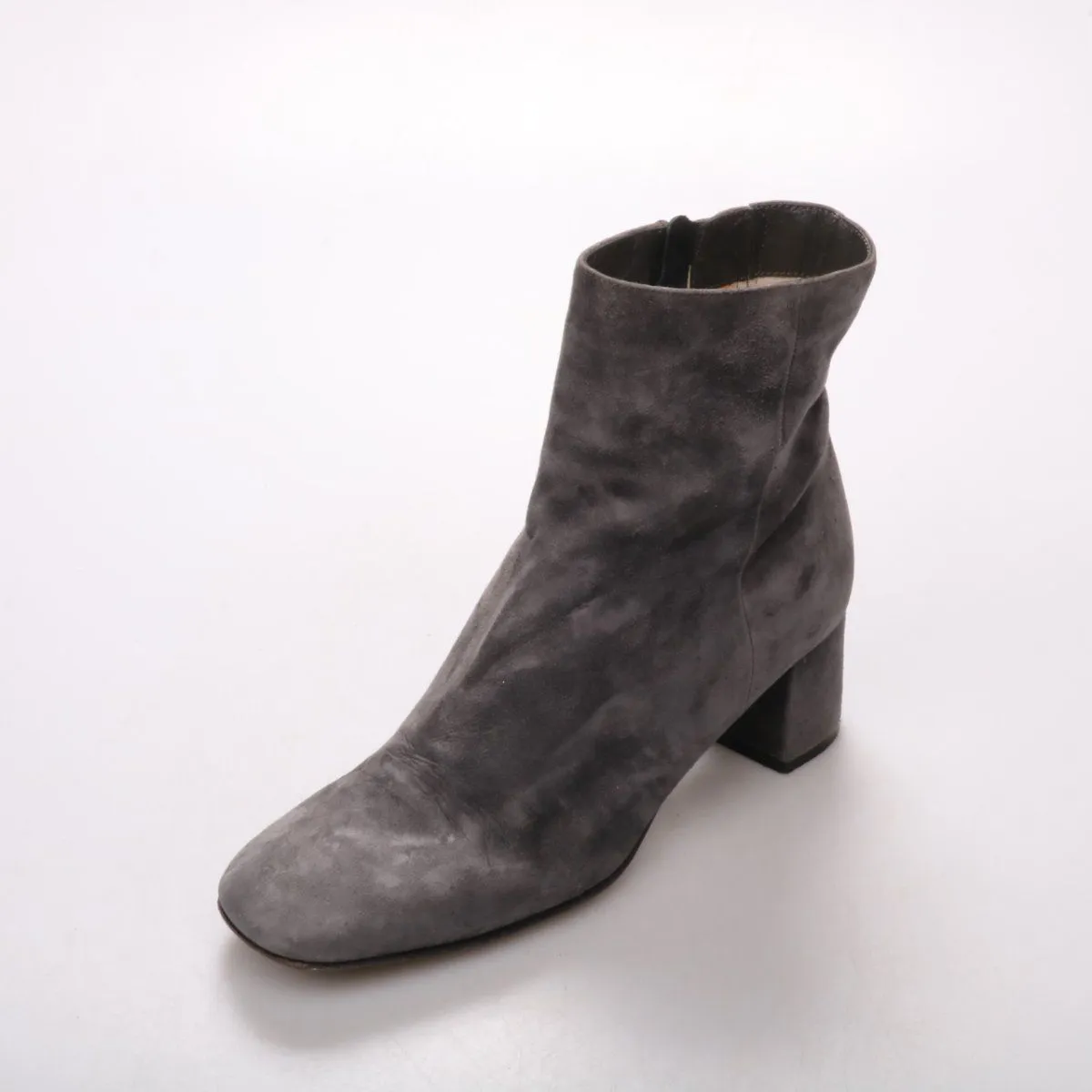 Женские серые ботильоны из натуральной замши на устойчивом каблуке, застёжка на молнию сбоку. Подойдут для повседневных образов в межсезонье с джинсами, брюками или платьями. Натуральная кожа внутри и удобный каблук делают их практичными для длительной носки.