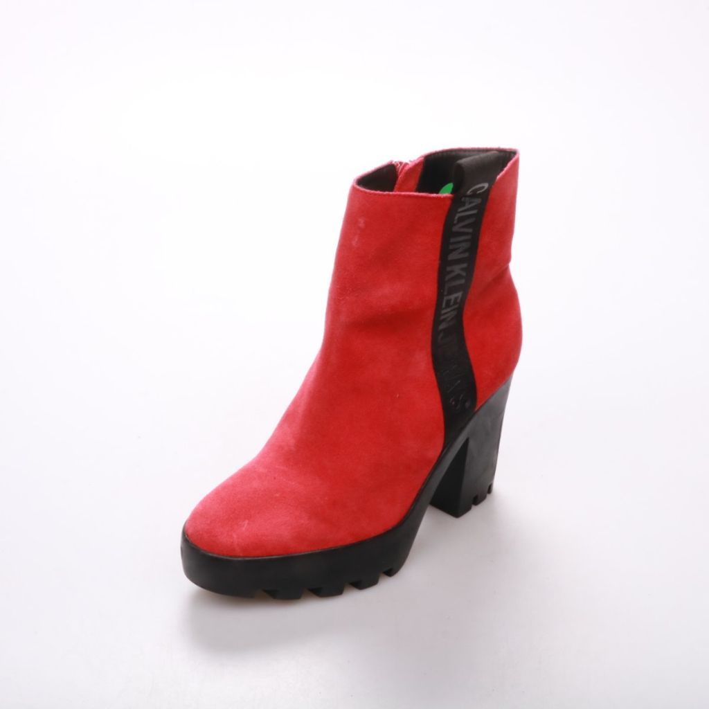 Женские ботильоны Calvin Klein из красной замши на устойчивом каблуке и тракторной подошве. Подойдут для повседневных образов в межсезонье, есть боковая молния для удобного надевания. Рельефная подошва даёт лучшее сцепление на мокром асфальте.